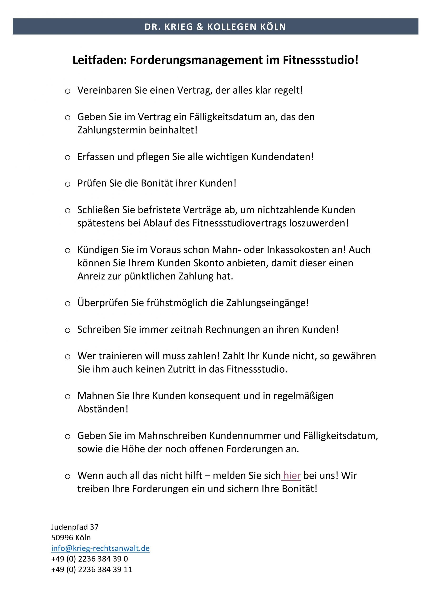Unser Ziel ist die Verbesserung Ihrer Liquidität von Beginn an unserer Zusammenarbeit. Keine Einrichtungsgebühren, keine Kosten vorab! Wir übernehmen den ganzen Ärger mit den säumigen Schuldnern ab Ihrer Buchhaltung und führen im Zweifel auch Klagen durch! Inkasso – Fitnessstudios – Dr. Krieg Köln!